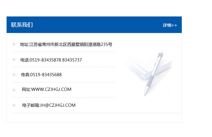 傳真:0519-83435688    郵編:213135    網(wǎng)址:WWW.czjhgj_com.kmsyy120.com    電子郵箱:JH@czjhgj_com.kmsyy120.com